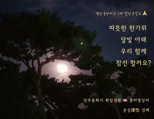 추석 한가위 인사 페이지 정보 작성자 관리자 작성일2025.10.29 조회18회 댓글0건 본문 🎵 음악 : Peace and power - Joanne Shenandoah - 추석날 새벽5시 예불아침6시30분 합동차례재대웅전에서 함께 합니다.오후3시까지 대웅전 오시어차례재 단에 참배 가능하세요.한가위 원만히 보내세요. #한가위_인사나눠요#운성스님_명상참선#진주용화사_화림선원 #꽃씨명상터 이전글 다음글 목록